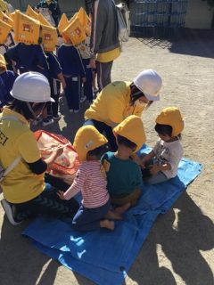 今日は,2歳児おひさまくらぶのお友だちも参加しました。先生と一緒に上手に避難できました。「おかしも」の約束を守って先生の話も静かに聞くことができました。