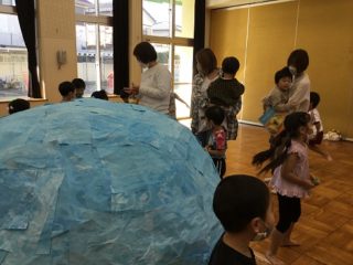 お帰りの後に,おゆぎ室にお邪魔して年中さんの共同制作を見学しました。大きな地球儀を見てびっくり!作品展が楽しみになりました。