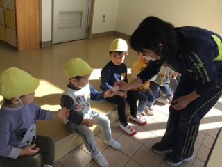 おもちをつきおわった後は,お持ちのできるまでを見学。もち米,一晩水に浸したお米,蒸したお米,つきあがったおもち。途中からおひさまくらぶのお友だちも参加して,みんなで上手にお座りをしてみることができました。