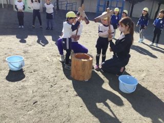 朝からもち米を蒸すいい香りが玄関に充満し,子ども達の気分をかきたたせてくれました。天気も良く園庭でおもちつき。みんなで,「ぺったんこ」と数を数えながら順番におもちつきをしました。年長さんは,「きねとうす」の名前を教えてもらい,ついていました。