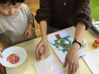 クリスマスの紙芝居を見た後は,お待ちかねサンタさんの登場!来てくれたことにびっくりしていましたが,プレゼントをもらってとても嬉しそうでした。最後は笑顔で記念撮影でした。