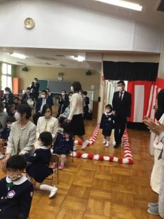 突き抜ける青空のもと,第60回入園式を行いました。おゆぎ室への入場はちょつぴりドキドキ。でもお家の人と手をつないでいるから安心感もありました。