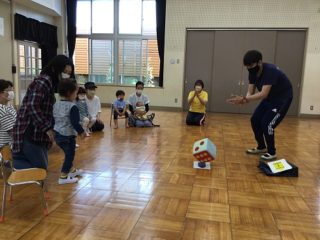 親子参加型未就園児教室「エンジェルクラブ」の無料体験教室を本日行いました。5組の親子が参加してくれました。まず始めはホセ先生とふれあい英語遊びです。色の単語を英語で言ってみたり,サイコロゲームをしました。