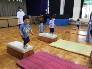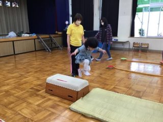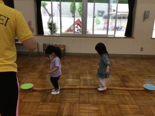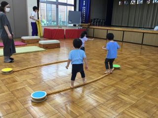 今日は,体操の先生と一緒にサーキット遊び。準備体操を万全にしてから,カニさん,うさぎさん,ワニさんに変身してサーキットを楽しみました。