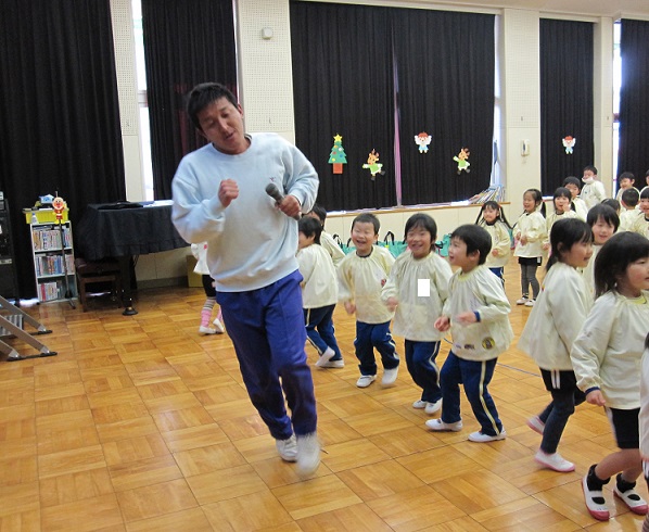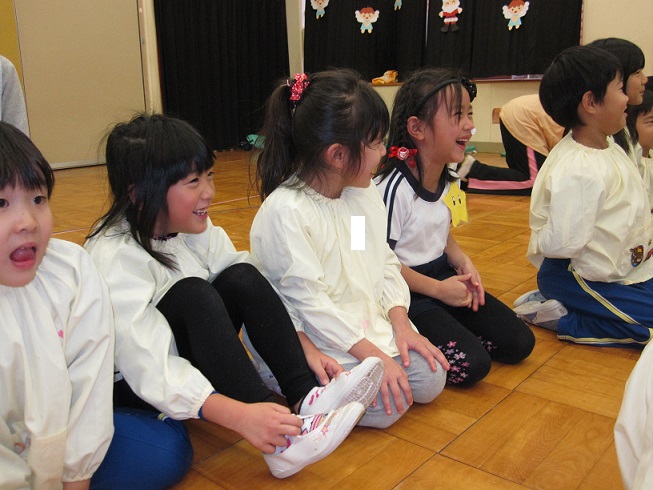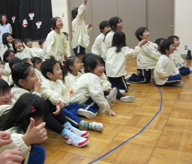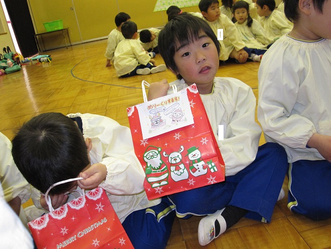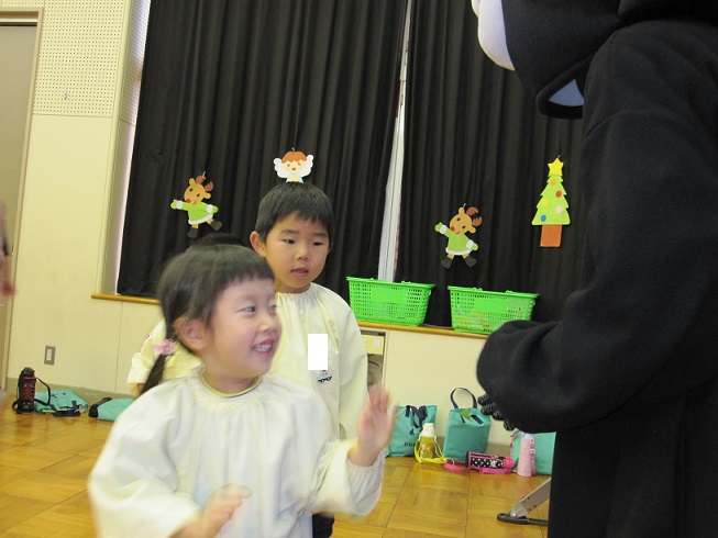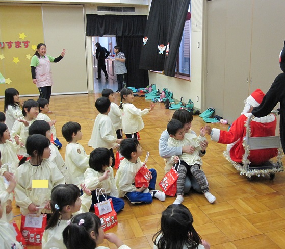 そして・・・最後にはスペシャルゲストの登場!!サンタさんがお友達をつれてきてくれました。登場した瞬間、驚きで一瞬口をあけて固まった子ども達(笑)そのあとは身を乗り出して大興奮でした!