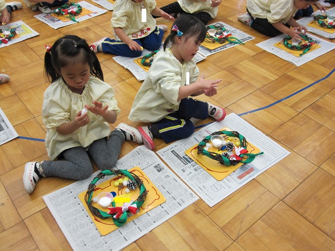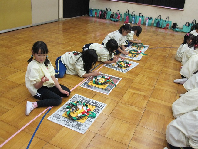 その後、半田運転手さんがさつまいものつるで作ってくれたリースにみんなで飾り付け。とってもかわいいリースが完成したので、おうちに持ち帰りましたらぜひ飾って下さいね。