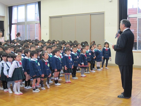 角栄幼稚園のお友達が全員おゆうぎ室に集合し、園長先生のお話を聞いたり、2学期を振り返ったり、みんなで園歌をうたいました。