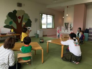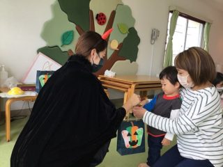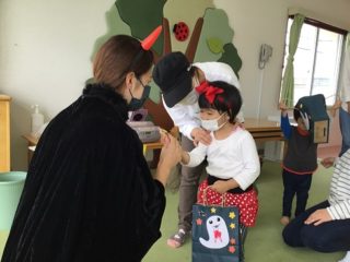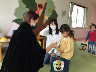 今日のエンジェルクラブはハロウィンバックを作りました。ハロウィンの話を園長先生からきいて,ハロウィンにちなんだ品物がかくれんぼしているのをみんなであてっこしました。