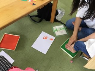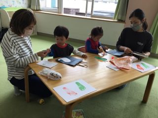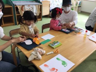 ハロウィンバックにかぼちゃとおばけを作って貼りました。かぼちゃの形は一部足型を使用しました。足スタンプに「きもちぃ」と両足の型をとって満足そうでした。「おばけの口はどんな形にしようかなぁ」と考えながら描いて,目のシールを貼って袋に貼りました。かぼちゃのパーツも,まわりにのりを貼ってかわいく仕上げることができました。おばけのまわりにお花の飾りや星をつけて完成です。