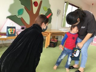 最後は,「トリックオアトリート!」と元気よく言って,ヘザー先生からクッキーのお土産をもらいました。