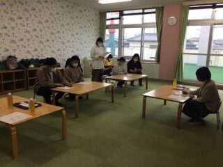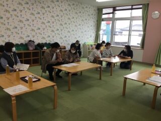 まずは,グループワーク。2つのグループに分かれて,我が子の良いところを伝えあったり,ワークシートを利用して,日頃の朝の忙しい時間の中での声掛けの事例をもとに「親の気持ち」「子の気持ち」を考えたうえで,改善策をグループごとに話し合い発表しました。話し合いの中で様々な言葉がけや方法が出てきて,かかわり方一つでこんなにも子どもの行動が変わり,やる気を引き出すことができるということを,気づくことができました。