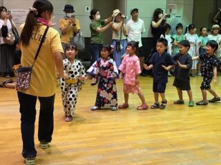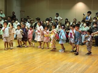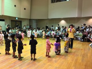 7月15日に東藤沢公民館にてふるさと祭りが開催され,角栄幼稚園の年長の子ども達が,夕涼み会で踊った夕涼み披露ました。大変暑い日ではありましたが,室内で元気よく踊ることができました。