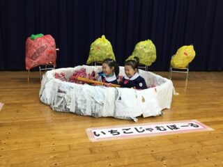 年長さんは「どこへいったのいちごちゃん」でした。子ども達の豊富なアイディアでいちごジャムのプールが完成!プールに入って楽しみました。
