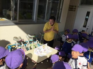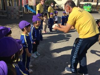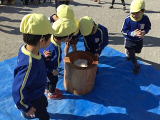 今日は,待ちに待ったおもちつき。「明日のためにたっぷり寝て,筋肉マッチョの体できてね」と先生に言われていた子ども達は元気に登園してきてくれました。園庭に出て先生のお話を聞きながらワクワクしていました。