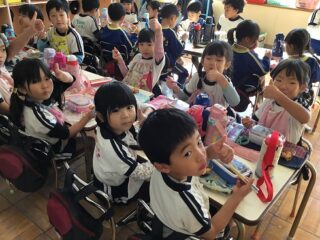 おもちつきの後は,近隣の「菓心 かめだや」さんのみたらし団子をみんなで食べました。同じもち米からつくられているお団子をみんなぺろりと美味しく食べました。