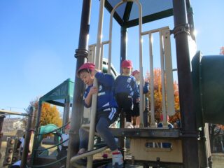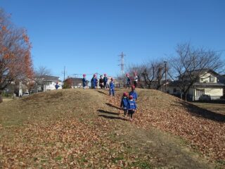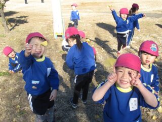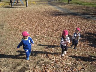 その後は,遊具や山,落ち葉等自由遊び。落ち葉を踏むとカサカサ音がして,落ち葉のシャワーも楽しみました。