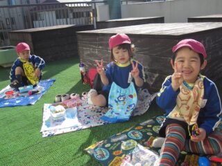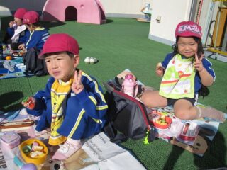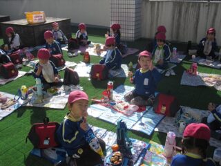 思い切り遊んで幼稚園に戻り,2階のテラスでおいしいお弁当を食べました。青空のもとでのお昼ご飯は,笑顔でいっぱいでした。「公園またいきたいね」「たくさん走ったね」と感想があちらこちらから声が聞こえました。