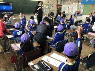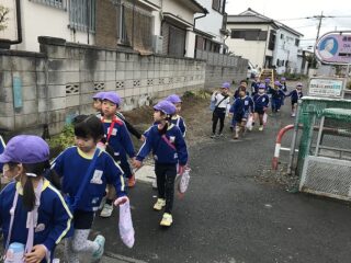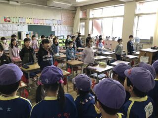 あと1ヶ月ほどで卒園してしまう年長さん。近くの藤沢東小学校の1年生と毎年交流学習をしています。今日は,3時間目の授業を体験してきました。学校につくと,20分休みの時間でした。学校の先生に迎えられてご挨拶しました。校庭をぐるりとひと回りしてから教室に入りました。