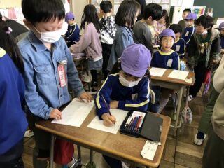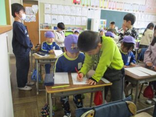 1年1組の教室に入ると,1年生が校歌を歌って出迎えてくれました。机に座るとすっかり緊張してしまった年長さん。1年生のお手本を見ながら丁寧に文字を書きました。1年生のお兄さんお姉さんに花丸をつけてもらったり,ごほうびシールをは貼ってもらってにっこりでした。