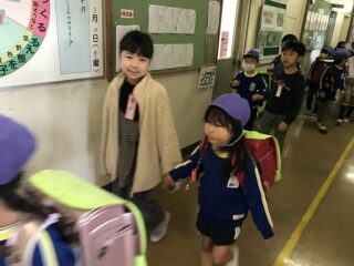 お勉強の後は,ランドセルを背負わせてもらい廊下の歩き方を体験しました。右側通行で1年生と手をつないで歩きました。卒園児の1年生と楽しく歩くことができました。