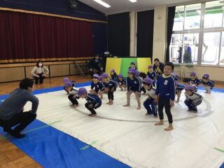 今日は,入間市のわんぱく相撲の方々がお相撲を教えに来てくれました。年長さんが相撲の体験をしました。はじめにしこを踏んでみたり相撲の実際の動きをしてみました。