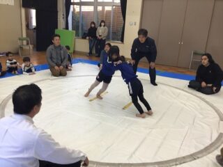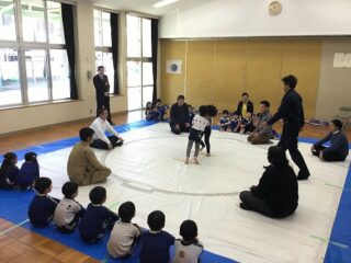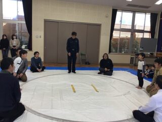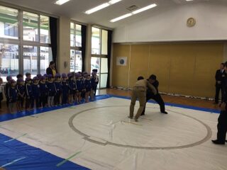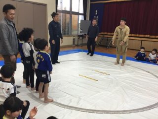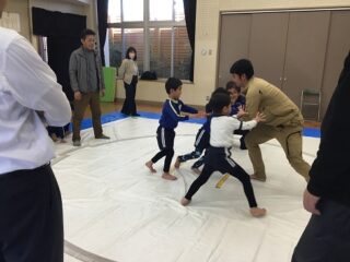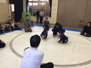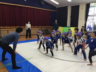 軽く身体を動かした後は,相撲のルールを教えてもらいました。相手の手を組むのではなく,腰を持つとかはじめと終わりの挨拶は,お腹から出して大きな声で挨拶する等みんな真剣に話を聞いていました。実際にお手本を見せてもらいました。なんとお手本を見せてくれたお兄さんは,角栄幼稚園の卒園児。大きくなって年長さんに楽しく相撲を教えてくれました。