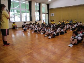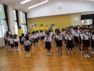 1学期楽しく過ごしてきた幼稚園も、今日で終わりです。おゆうぎ室にみんなで集まって終業式を行いました。今日は満3歳児教室「ほし組」さんも終業式に参加しました。