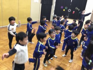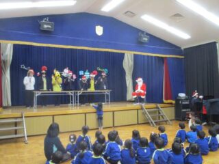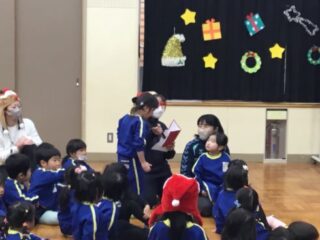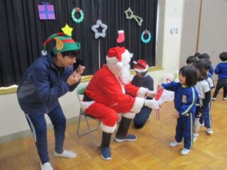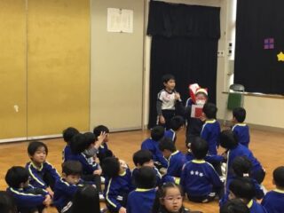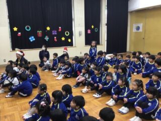 サンタさんがプレゼントをもってきてくれたので、先生たちからはハンドベルの演奏、みんなからはクリスマスのダンスをお礼に踊り披露しました。