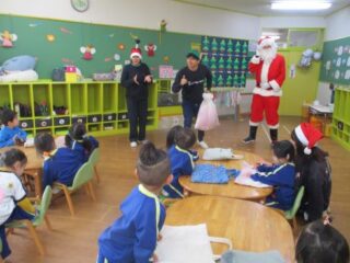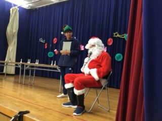 鈴の音が聞こえると、その音をかき消すかのようなみんなの喜びの声が、おゆうぎ室中に響きわたりました。各クラスからサンタさんへの質問コーナーは、ホセ先生がサンタさんに伝えサンタさんは大きな声で答えてくれました。