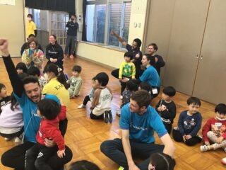 3月26日(火)・27日(水)の2日間でVantage Japanによるスプリグスクールが開催されました。年少さんと年中さんのお友だちは,たくさんの英語の先生とふれあい英語遊びをしました。おゆうぎしつでオープニングのご挨拶。歌やダンスをしました。