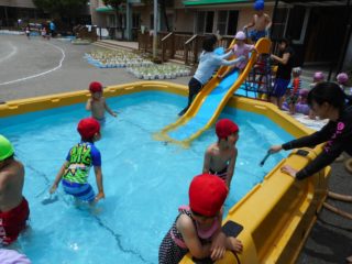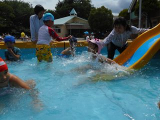 プールに入ると「つめたーい」と驚いていた子どもたち。徐々に水温に慣れ、先生やお友だちと思いきり水をかけあったり、貝殻を拾ったり、一番楽しみにしていたスライダーを滑ったりと水の気持ち良さを存分に味わうことができました。