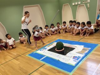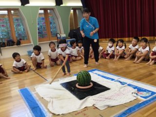 今日は、何日も前から楽しみにしていたすいか割りでした。あいにくのお天気だったため、お遊戯室で行いました。