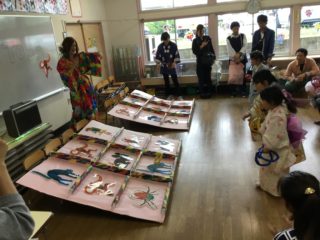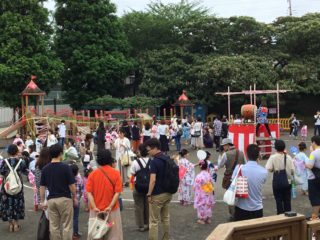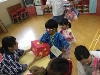 子どもたちは、可愛らしい甚平や浴衣を着て、お家の人と元気に登園してきました。午前は、残念ながらあいにくのお天気で、園庭で行う予定だった『ドラえもん音頭』と『アラレちゃん音頭』は中止となってしまいました。午後は年長組さんのパワーなのか、雨がやみ、元気いっぱい戸外で踊ることができました。