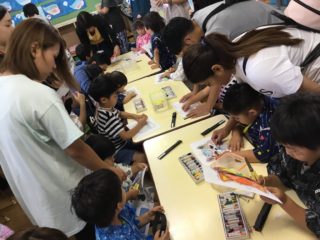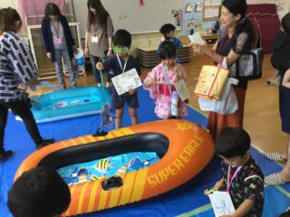 さかなつりやおめんづくり、あたりくじなどのお店をまわり、スタンプを集め、全部たまると「ジュースもらってくるの!」とうれしそうでした。