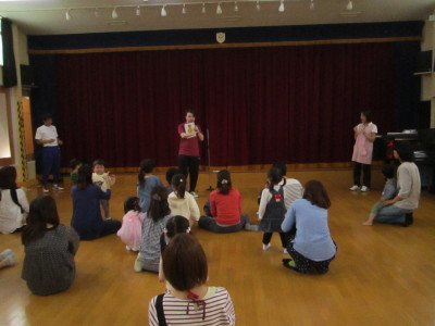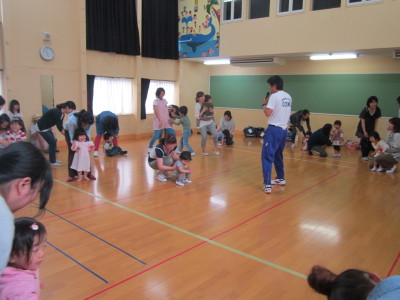 まずはみんなで幼稚園のお友だちと同じように、朝の歌やごあいさつから始まり、英語の先生と英語あそびもしました。