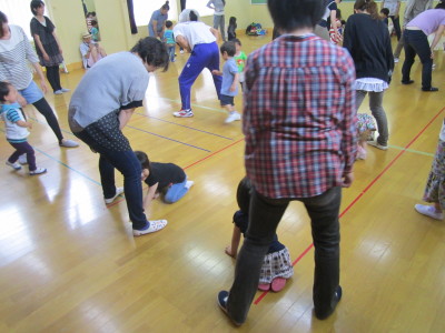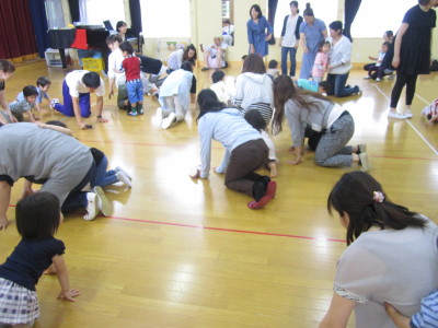 今日のメインの活動は体操の先生と一緒に親子体操です。ふれあい遊びや柔軟体操、リズム体操にゲームと盛りだくさんの内容でした。子どもたちはもちろん、保護者の方からもたくさんの笑顔が見られました。