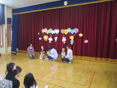 最後はお誕生会も行いました。お家の人と一緒に前に出てきて、冠とお誕生カードをもらいました。