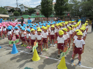 おひさまくらぶさんや年少組さんは初めの運動会。かけっこやお遊戯の練習にうれしそうに参加しています。
