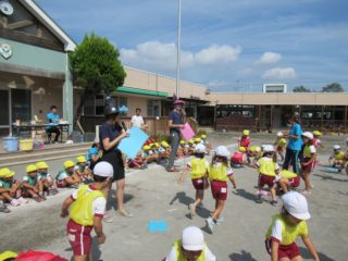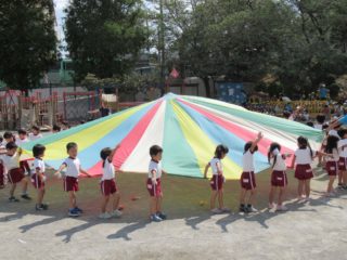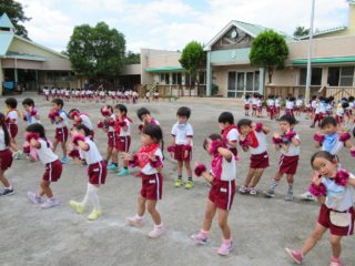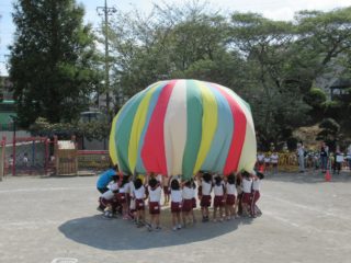 年中さんは、パラバルーン、障害物競争、お遊戯を行いました。