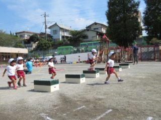 障害物競争では、巧技台を乗り越えたり、フープをくぐったり、とても楽しそうに取り組めました。