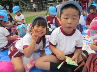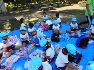 お芋を掘ったあとは草ぶえの丘でお弁当を食べました。仲良しのお友だちとお話したり、おやつを交換したりしながら楽しく食べました。