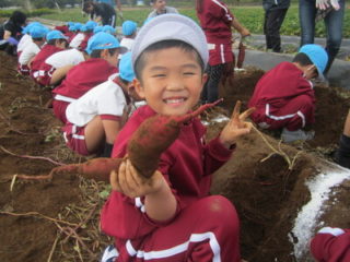 畑に着くと、腕まくりをしてお芋掘りがスタート。自分の力で夢中で土を掘り進め、お芋が出でくると「自分で掘れたよ!」「大きい!」と嬉しそうに見せてくれました.