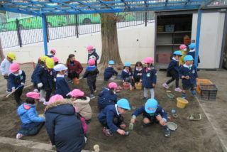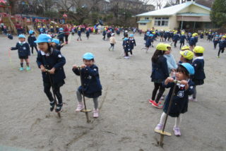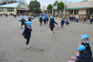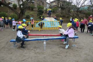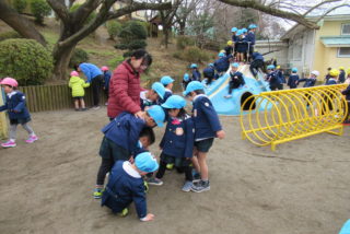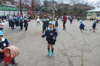 さっそく寒さに負けず、戸外で元気に遊びました。久しぶりに会ったお友だちと、夢中になって遊んでいました。