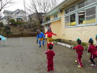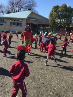 そのあとは、いよいよお面をつけて豆を持ち、園庭に準備万端で待っていると怖い顔をした鬼が出てきました。追いかけてきたり、中には鬼に抱え上げられていた子もいましたが、子どもたちはドキドキしながら勇気を出して「おにはーそと!」「ふくはーうち!」と元気いっぱい豆をまいていました。