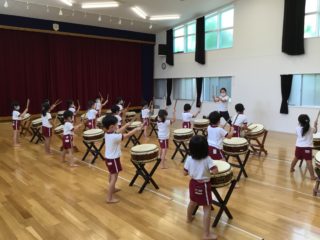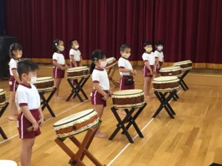 バチの持ち方や構えのポーズ、かっこいい立ち方など覚えることがたくさんあり難しそうにしている一面も見られましたが、先生の動きをよく見ながらまねをしようと一生懸命な子どもたちは、あっという間に基礎が身につき、練習を重ねるごとに上手に叩けるようになってきました。少し難しいリズムやかっこいい振り付けにも挑戦しながら着々と上達してきています。