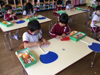 年中さんは、折り紙ですいかを作りました。