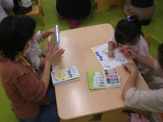 まず、スタンプカードに自分のお顔を描きました。先生の見本を見て、目はまる、鼻はさんかく…とクレヨンでかわいらしいお顔を描いていました。
