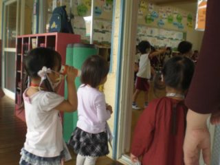 望遠鏡をもらったら、いよいよ出発です!園長先生にご挨拶したり、カメや金魚を見つけたり、おにいさん・おねえさんのお部屋ものぞいたりと興味津々で園内を探検していました。おうちの方々も「初めて絵本室の中を見ました!」等、新しい発見をしたり、保育の雰囲気を感じていただけたようでした。