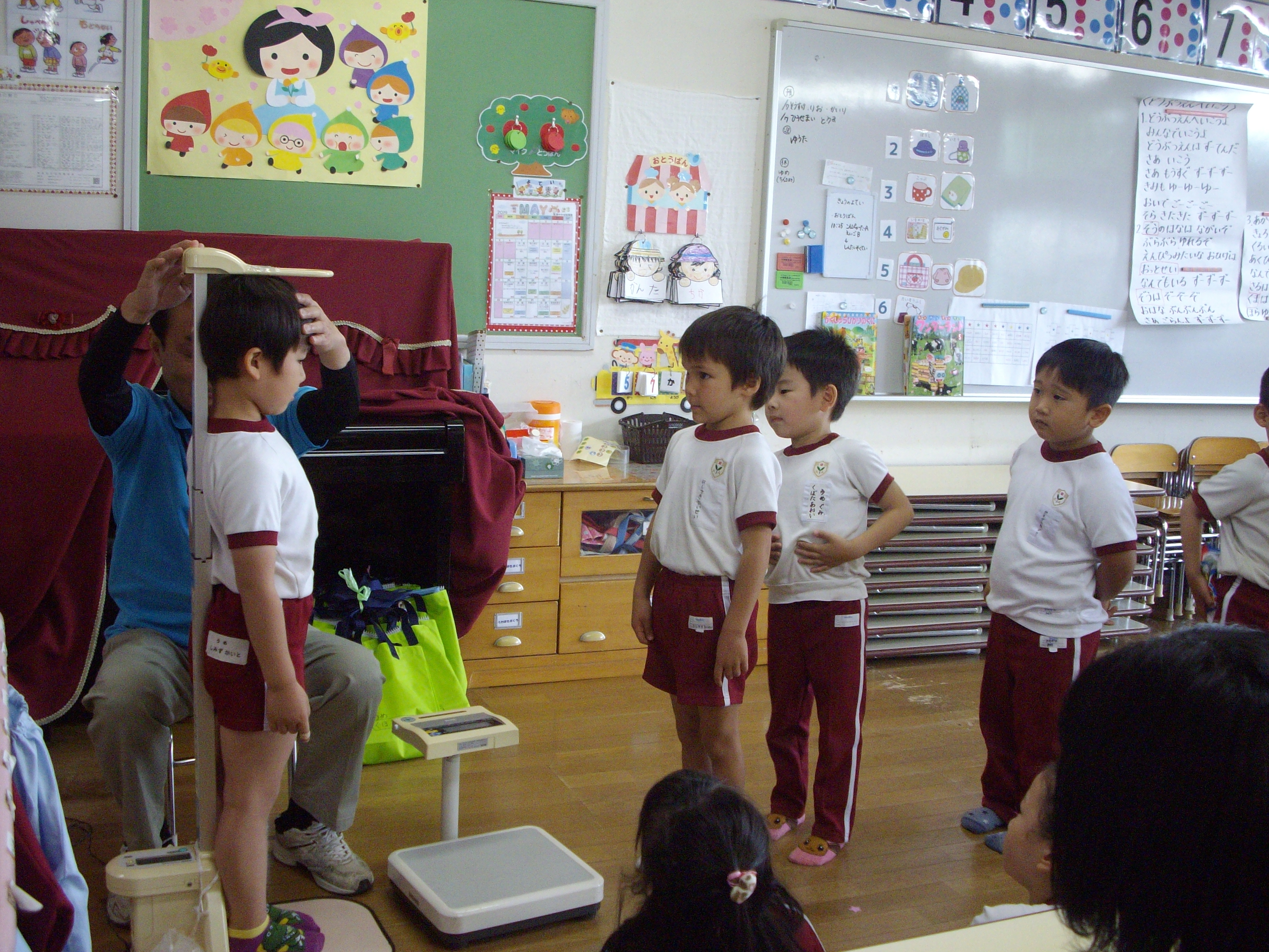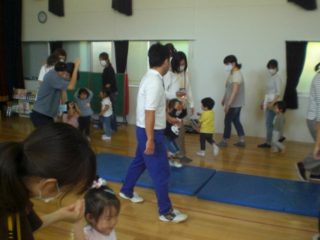 今月最後のエンジェルくらぶは、体操を行いました。体操は、体操の先生と一緒に、幼稚園で1番大きいお部屋「おゆうぎしつ」で、全員で行います。