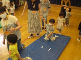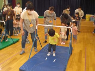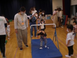 次は鉄棒です。ぶつからないようにくぐったり、先生から鉄棒の握り方を教わってぶらさがったりしました。やる前はお顔が緊張していた子も、おうちの人に励まされチャレンジできていました。